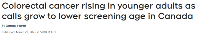 | | 近年来,加拿大年轻人患上结直肠癌的情况明显上升,引发医学界和公众的关注。多家机构正呼吁,将原本建议从50岁开始的常规筛查年龄,下调至45岁,以便更早发现疾病。根据加拿大癌症协会的数据... 时间:2026-03-27 18:36:29 | |