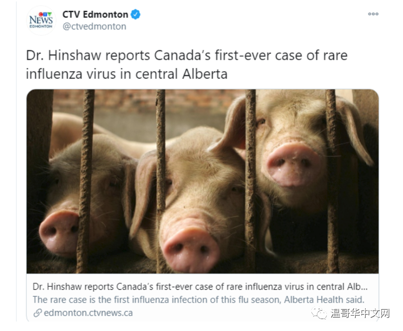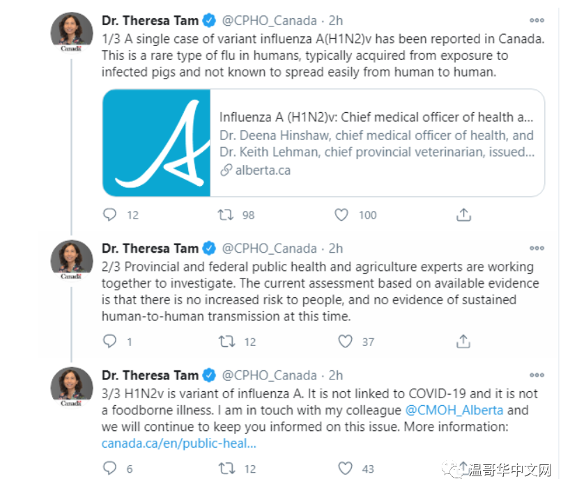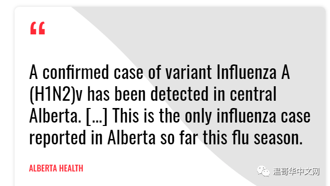 【环球中文网 cbeiji.com讯 】加拿大首席公共卫生官谭咏诗(Theresa Tam)今天发布一份通知,称加拿大报告了一例超级罕见的流感病例。