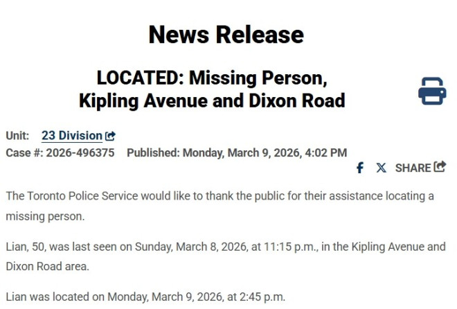 | | 多伦多警局发布通告,请求公众协助寻找一名失踪的华人女子。50岁的Lian最后一次被看到,是在3月8日周日晚上11点15分左右,地点位于Kipling Avenue与Dixon Road一带。... 时间:2026-03-09 22:52:14 | |