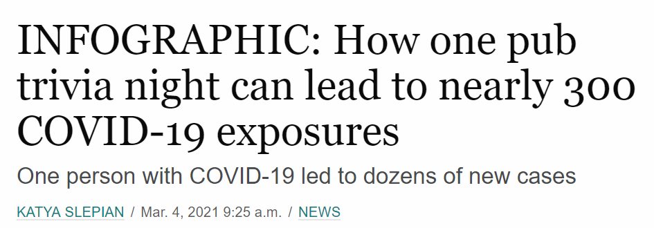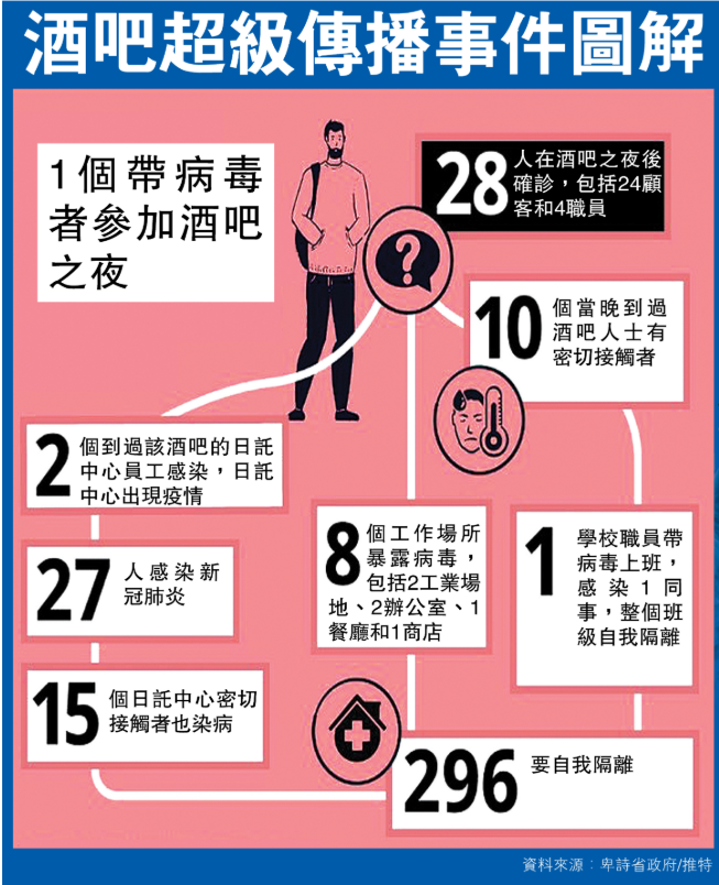【环球中文网 www.cbeiji.com讯】菲沙卫生局利用真实个案图解,说明一家酒吧的一个晚上,如何引发新冠病毒超级传播事件。在事件中,一个带着病毒者参加该酒吧之夜,最终令多人感染及多达296人要隔离。传播范围包括日托中心、学校、多个工作场所以及家庭成员。